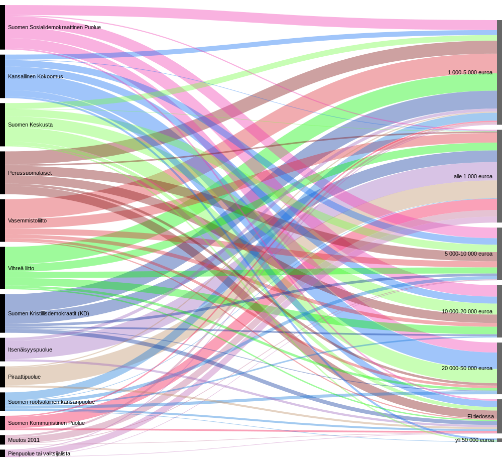 Suurimmat vaalibudjetit ovat kokoomuksen ja keskustan ehdokkailla. Pienpuolueilla on käytössä suppeampi vaalirahoitus. Sosiaalisen median aktiivinen hyödyntäminen voisi periaatteessa kompensoida pientä vaalirahoitusta. Sosiaalisesta mediasta on tosin näissäkin vaaleissa ostettu mainoksia.