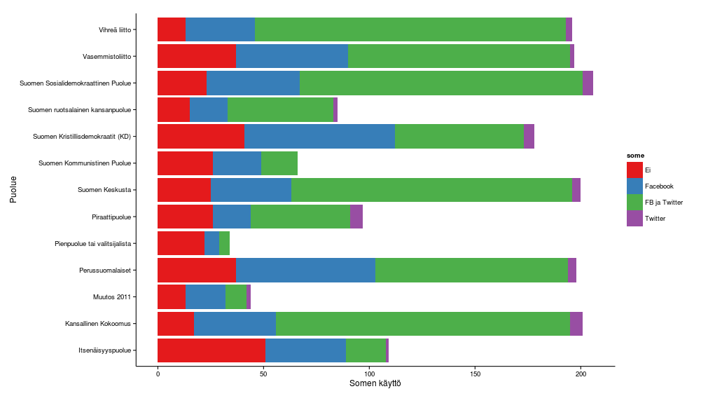 Vihreän liiton, kokoomuksen ja keskustan ehdokkaat ovat ilmoittaneet eniten Facebook- ja Twitter-tilejä. Joukosta löytyy myös ehdokkaita, jotka ovat ilmoittaneet vain Twitter-osoitteen, erityisesti kokoomuksen, SDP:n ja piraattipuolueen listoilta.
