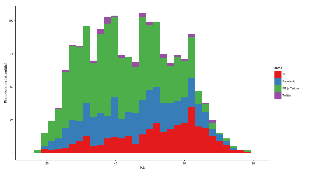 Perinteisesti on ajateltu, että some on nuorten juttu. Ylen Vaalikoneen aineisto kuitenkin osoittaa, että sosiaalinen media on jo valtavirtaa lähes kaikissa ikäluokissa. Yli 60-vuotiaiden joukosta löytyy vielä jonkin verran ehdokkaita, jotka eivät ole mukana Facebookissa eikä Twitterissä.
